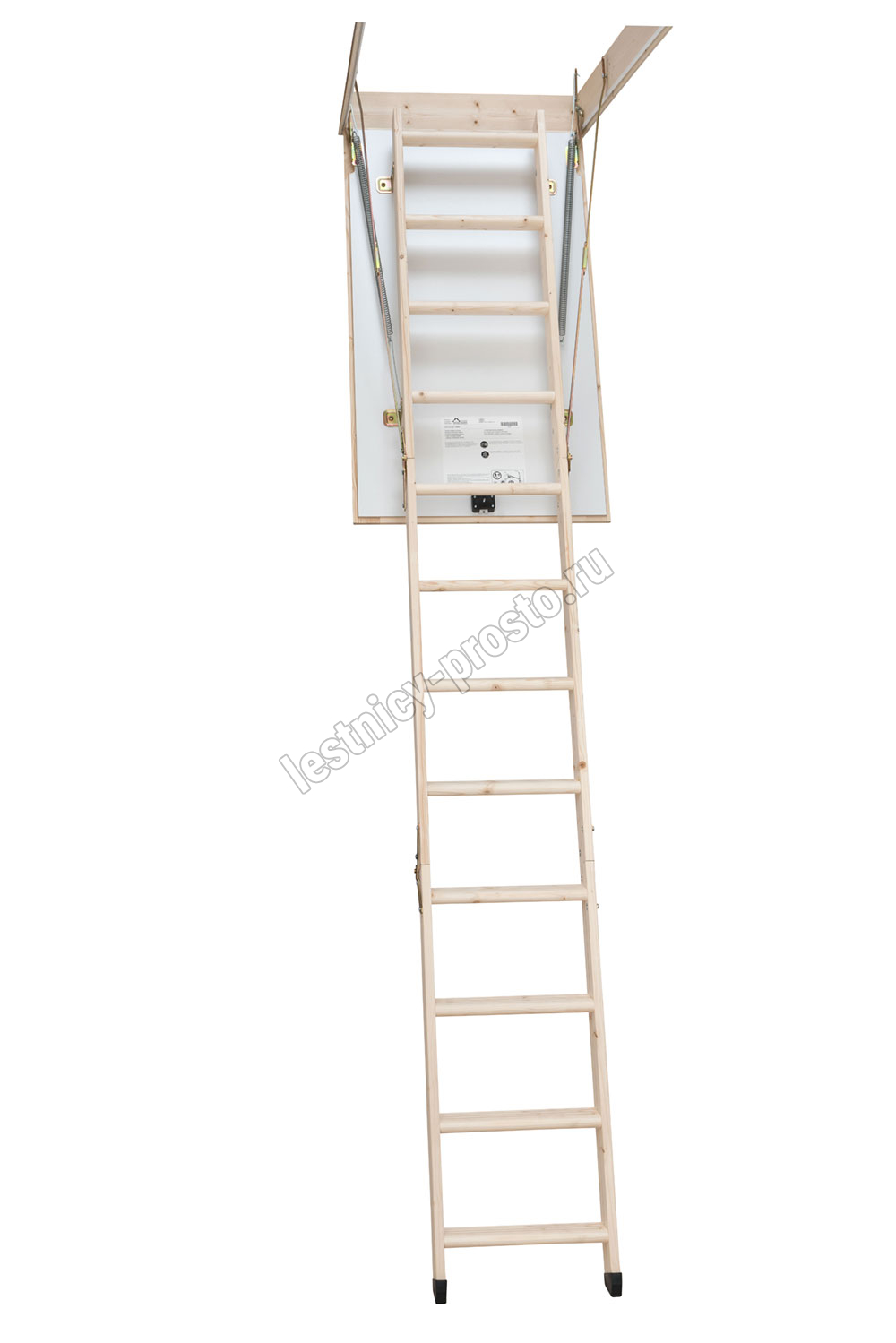 PROF 36 - трехсекционная утепленная лестница из скандинавской медленнорастущей ели, отличающейся повышенной прочностью, ступени из сосны, имеют антискользящие насечки. Лестница оснащена поворотным замком, надежно фиксирующим люк в закрытом состоянии. Высоту базовой модели можно увеличить при помощи дополнительной секции до 3500 мм. Размер короба: 1175х676 мм