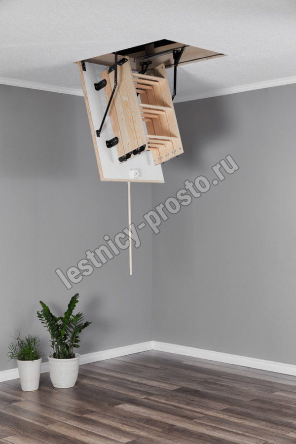 Лестница складная четырехсекционная, изготовлена из массива сосны. Термоизоляционная крышка типа "сэндвич" утеплена пенопластом толщиной 20 мм, облицована с двух сторон ДСП белого цвета.