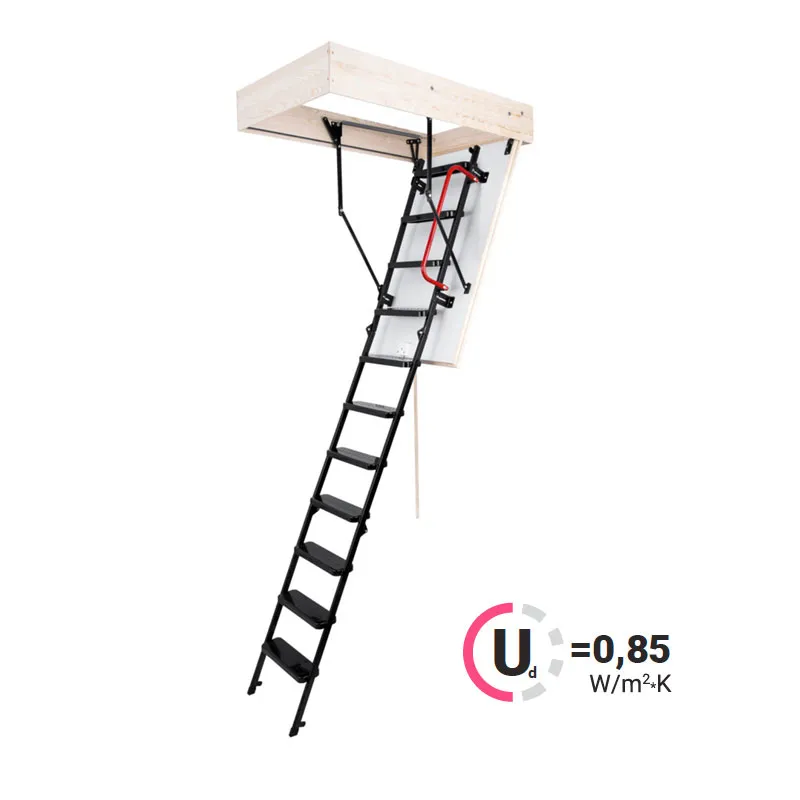 Лестница складная трехсекционная. Рабочая поверхность полностью выполнена из металла и покрашена порошковой краской. Термоизоляционная крышка типа "сэндвич", толщиной 47 мм, утеплена пенопластом, облицована с двух сторон ДCП белого цвета.