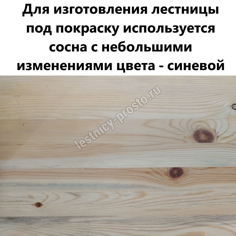Обратите внимание! Данный вариант лестницы изготовлен из сосны эконом-класса - это сосна с заметными местами синевы, такая особенность никак не отражается на прочности и надежности лестницы, но может быть заметна при прозрачном покрытии или покраске лестницы в светлые тона.