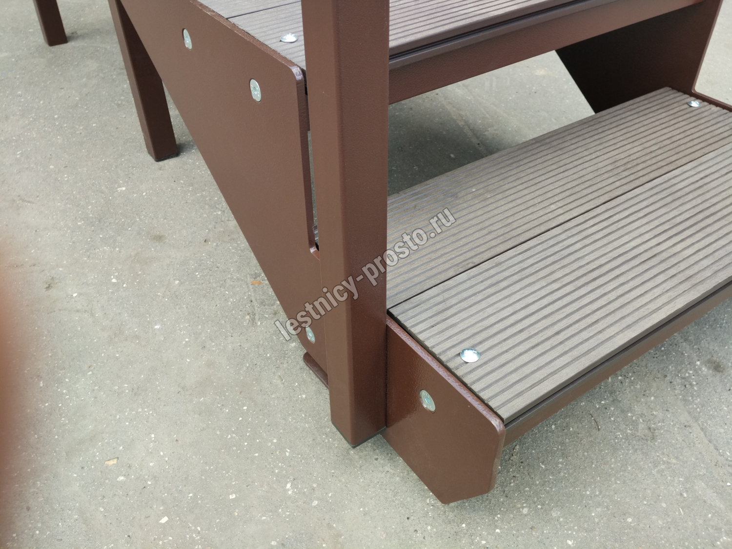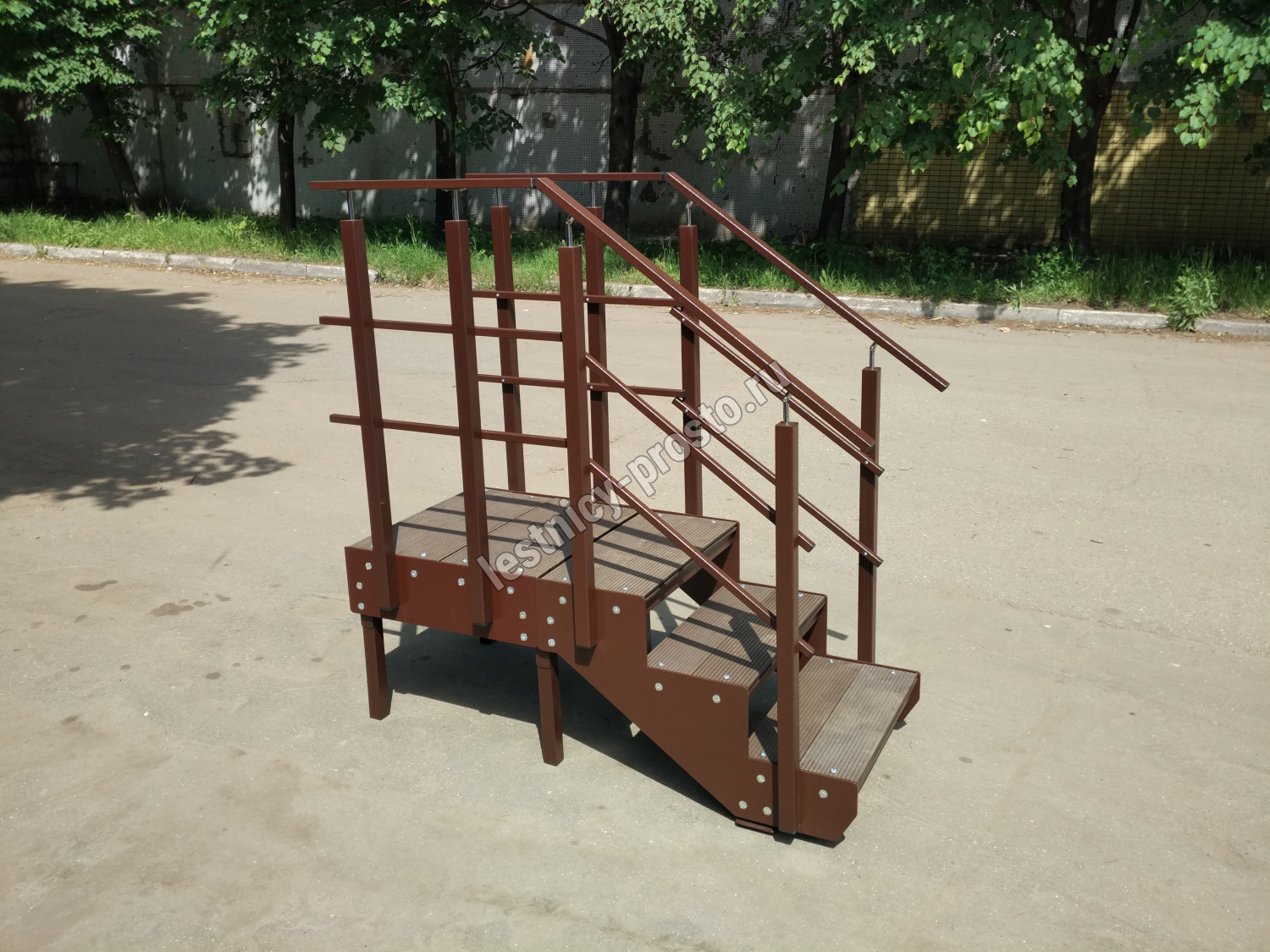 Ступени лестницы состоят из металлической рамки, обеспечивающей необходимую прочность, и покрытия из террасной доски ДПК (древесно-полимерный композит). Ступени не боятся воды и мороза, не теряют со временем свой внешний вид и не требуют ухода.